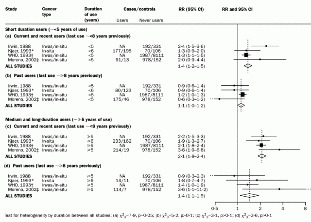 上の図のように、すべての研究の結果を統合すると、子宮頸がんの相対リスクは使用期間が長くなるにつれて増加しました。経口避妊薬の使用期間がおよそ5年未満では1.1倍、5~9年で1.6倍、10年以上の場合では2.2でした。