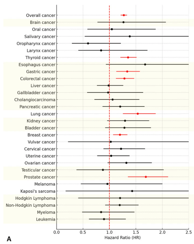 上の図は、全体および29種類のがんのリスクです。赤いグラフが有意に増加したものです。